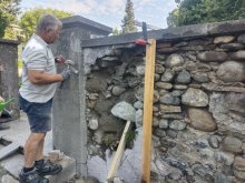 Bei den Friedhofsmauern löst sich stellenweise der Verputz und die darunterliegenden Mauersteine sind lose. Um zu sehen, ob und in welcher Form derartige Mauerteile saniert werden können, haben wir einen durch Risse stark betroffenen etwa 2 Meter langen Teil der Mauer vom vorhandenen Verputz befreit.