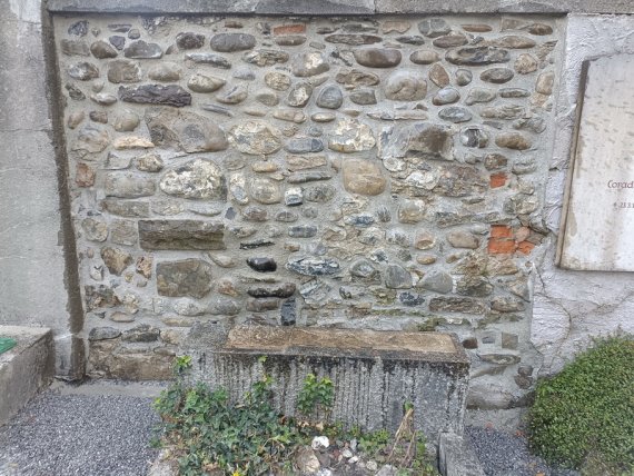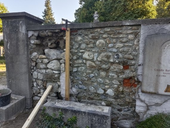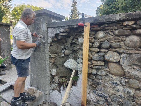 Bei den Friedhofsmauern löst sich stellenweise der Verputz und die darunterliegenden Mauersteine sind lose.
