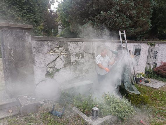 Bei den Friedhofsmauern löst sich stellenweise der Verputz und die darunterliegenden Mauersteine sind lose. Um zu sehen, ob und in welcher Form derartige Mauerteile saniert werden können, haben wir einen durch Risse stark betroffenen etwa 2 Meter langen Teil der Mauer vom vorhandenen Verputz befreit.